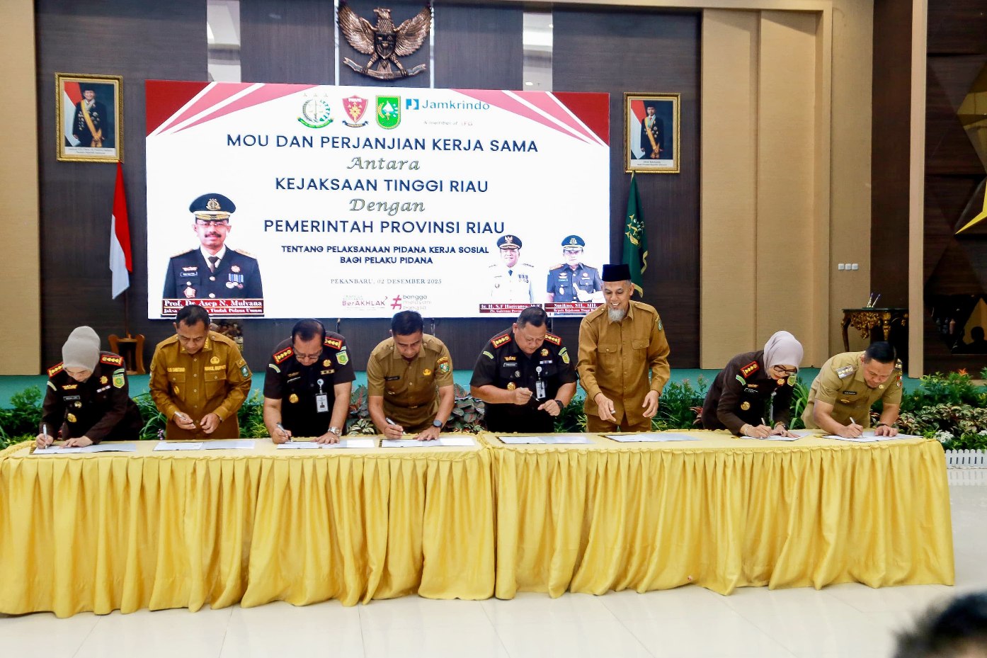 Wali Kota Pekanbaru Agung Nugroho bersama Kajari Pekanbaru menandatangani nota kesepahaman terkait hukuman kerja sosial, Selasa (2/12/2025). Foto: Istimewa.